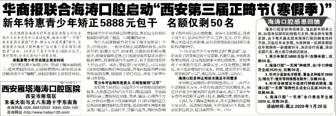 为庆祝陕西海涛医疗科技集团有限公司在全球中小企业交易中心成功挂牌,海涛口腔“一天得”技术荣获华商报“守护·群众生命高质量”称号,华商报联合海涛口腔特推出“西安第三届正畸节寒假季”活动。18岁以下青少年矫正5888元包干,限时限额,全市仅剩50个特惠名额。