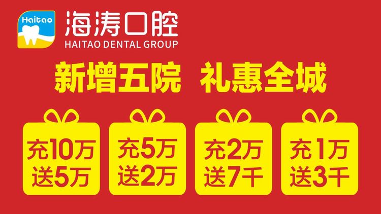 为了让更多的患者享受更接地气的实惠,海涛口腔为庆祝新增五院盛大开业,特推出充值活动就送诊疗费,力度空前。充值10万元,送5万元充值诊疗金额;充值5万元,送2万元充值诊疗金额;充值2万元,送7千元充值诊疗金额;充值1万元,3千元充值诊疗金额。