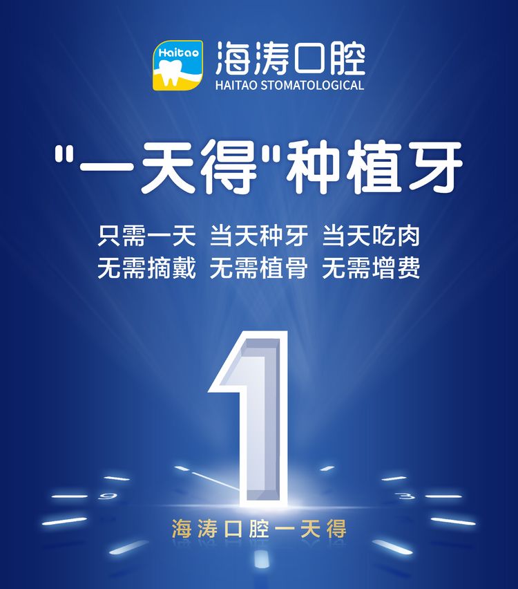 “一天得”全口种植牙技术是海涛口腔的特色种植技术,它能以极少的种植体完成种植修复。仅植入4-6颗种植体就可解决半口无牙问题,而且在其数字化技工中心的配合下,当天种牙,当天就可佩戴固定义齿,当天就可享受美食。